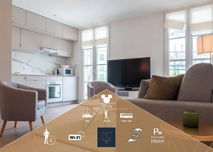 Апартаменты оснащены такими удобствами для самостоятельного приготовления пищи, как микроволновая печь, кофеварка и посудомоечная машина. В апартаментах вы найдёте кофеварку, что обеспечивает гостям удобное и приятное пребывание. В ресторане Le Dragon d'Europe, расположенном примерно в 14 минутах ходьбы, гостям предложат блюда азиатской кухни. Аэропорт Шарль-де-Голль находится в 39 минутах езды, а автобусная остановка Les Marmousets - в 5 минутах ходьбы.